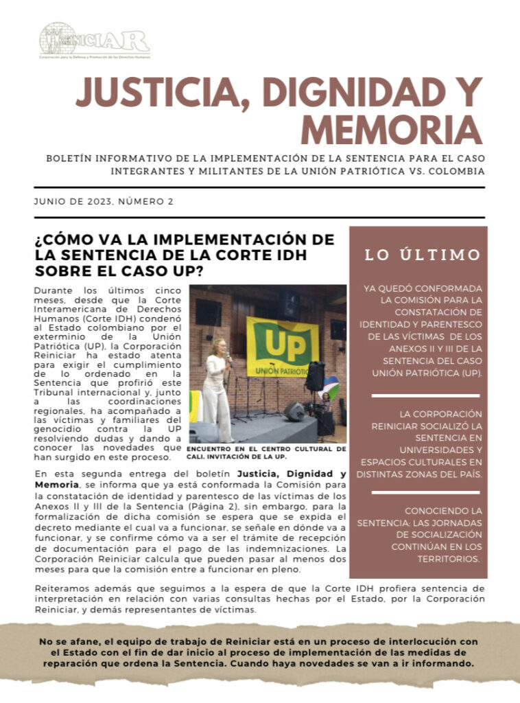 Justicia, Dignidad y Memoria: segunda entrega del boletín informativo de la implementación de la Sentencia sobre el Caso Unión Patriótica (UP) 30 de junio de 2023